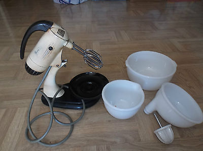 Vtg Sunbeam Mixmaster Mixer w/ Glassbake Milk Glass Mixing Bowls Model 7b