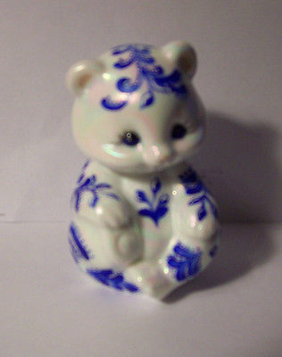 FENTON ART GLASS MILKGLASS IRIDIZED BEAR HAND PAINTED COBALT BLUE TOILE DESIGN