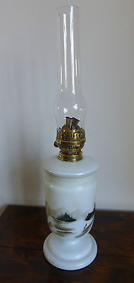 Lovely Hand Painted Milk glass Oil Lamp, English brass double burner & chimney