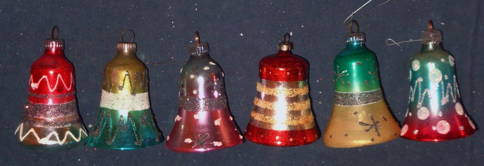 Title (ebay affiliate link): 6 Vtg Shiny Brite Blown Glass Christmas Ornaments Hand Painted Mica Bells