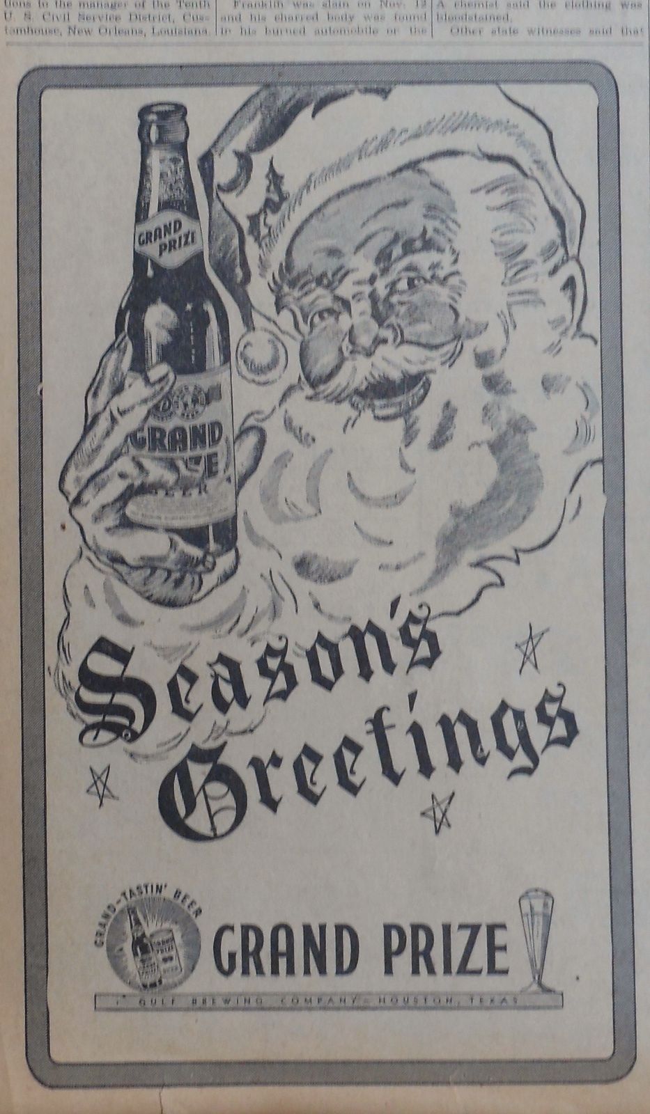 1941 newspaper ad for Grand Prize Beer - Santa with beer bottle, Christmas ad