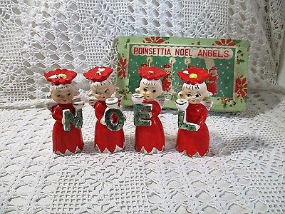 VINTAGE JAPAN COMMODORE PORCELAIN NOEL ANGELS CANDLE HOLDER POINSETTIA CHRISTMAS