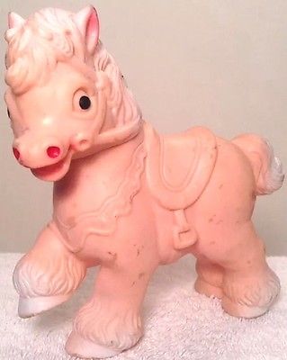 Title (ebay affiliate link): 1950s SUN RUBBER Co. Prancing Toy Horse Squeaks & Head Turns