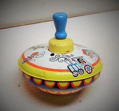 Title (ebay affiliate link): VINTAGE OHIO ART TIN SPINNING TOP TOY 1950s CIRCUS THEME METAL WORKS GREAT