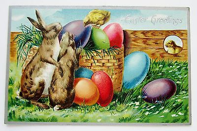 Vivid EASTER RABBITS & Lamb Chick with Colorful EGGS Postcard Tuck EMB