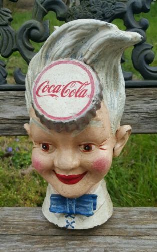 Title (ebay affiliate link): Cast Iron coca cola boy coin Bank button bottlecap sign antique vintage coke