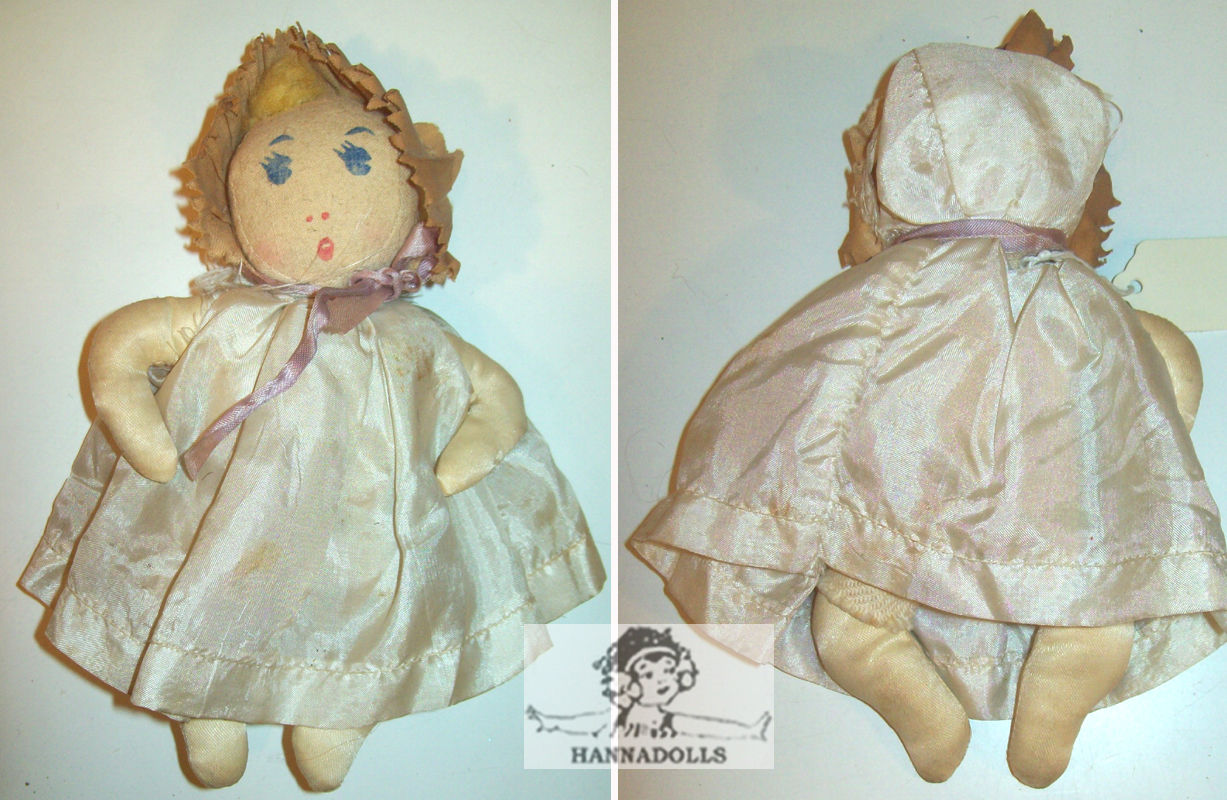 Title (ebay affiliate link): 6" Antique Printed Face Cloth Baby Doll Cotton Body Silk Dress Good Condition~~