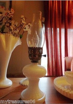 Title (ebay affiliate link): Vintage Fenton Milk Glass Hob Nail Hurricane lamp converted to Electricity