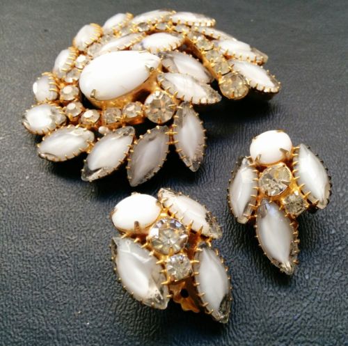 Title (ebay affiliate link): Vintage Unsigned Designer Milk Glass Rhinestone Flower Brooch Earring SET L134