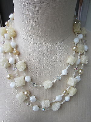 VINTAGE Multi Strand White Milk Glass Quartz Stone Faux Pearl Bead Necklace