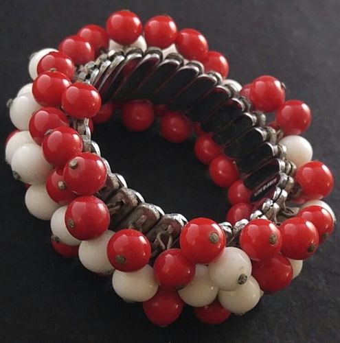 Title (ebay affiliate link): Vtg Expansion Bangle Bracelet Dangle Cluster Round Red Milk Glass Bead Fun P171