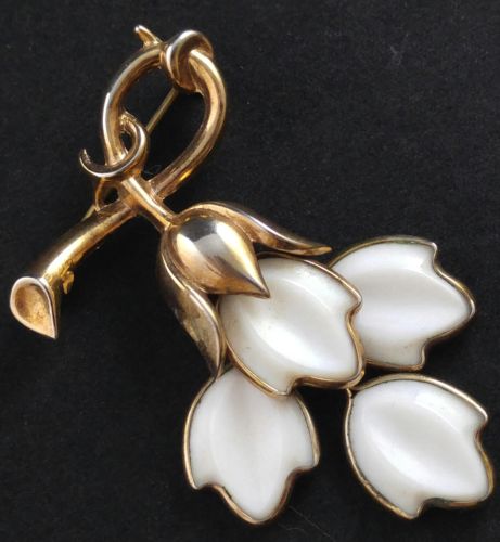 Title (ebay affiliate link): Signed CROWN TRIFARI Vintage Brooch Pin Flower Leaf Swirl Dangle Milk Glass P179