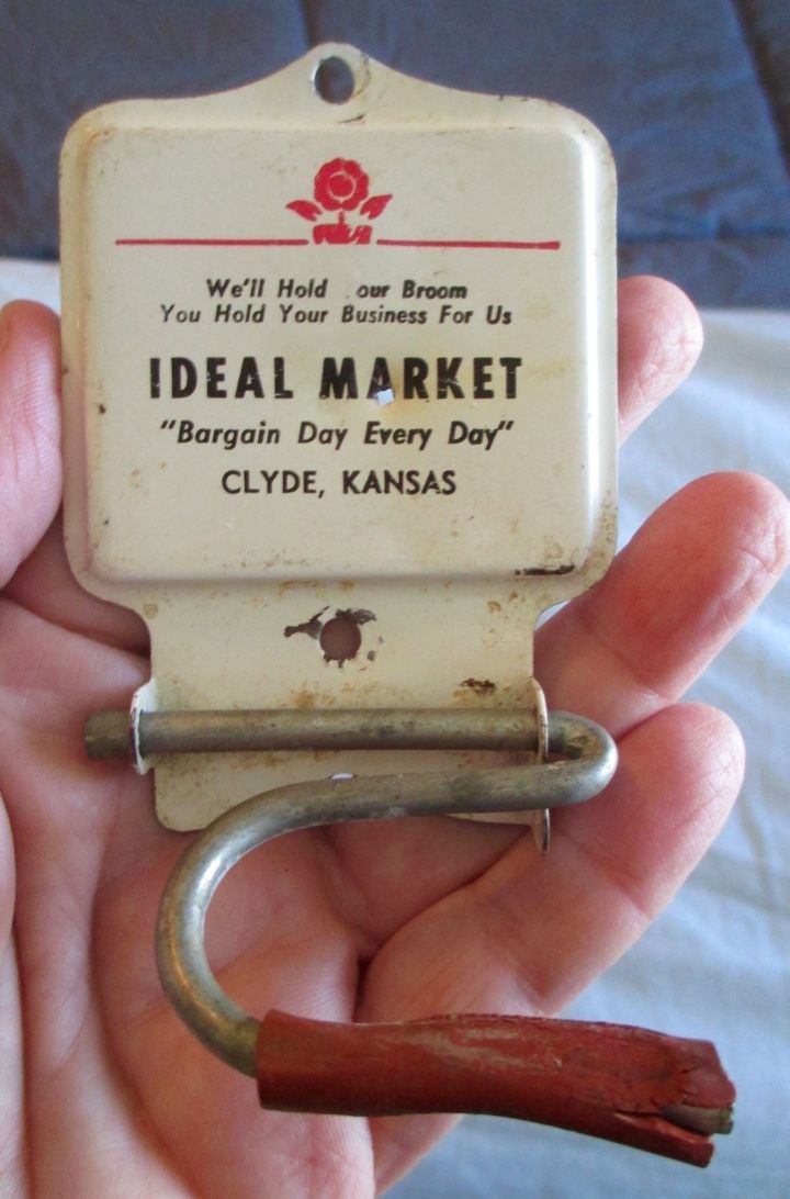 1940s IDEAL MARKET Metal BROOM HOLDER...Clyde, Kansas