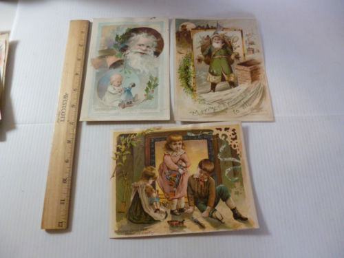 Woolson Spice Lion Coffee 3 Christmas Trade Cards Green Santa & more 1890s