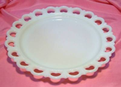 MILK GLASS CAKE PLATE WITH OPEN HEART LACE EDGE