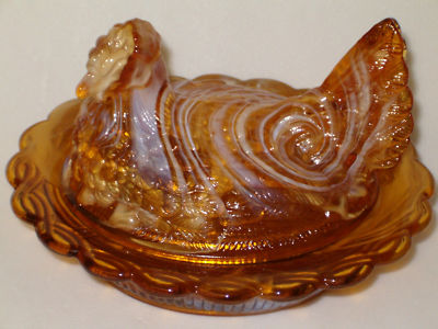 AMBER & MILK SLAG GLASS HEN CHICKEN ON NEST BASKET DISH
