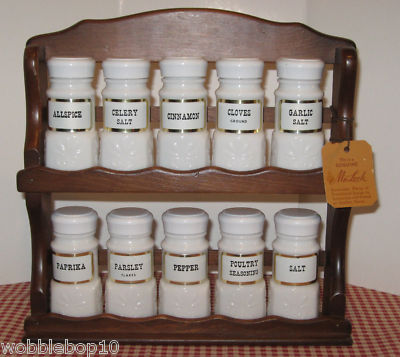 Vintage Milk Glass Spice Bottles Jars & wooden rack