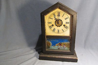 Antique New Haven Shelf Clock w/Reverse Painted Duck Hunting Scene- Clock Works
