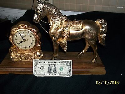 Title (ebay affiliate link): ANTIQUE UNITED MANTEL CLOCK & METAL WESTERN HORSE ON WOOD BA SE 17"X11"