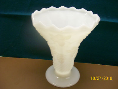 Milk Glass 6 1/2" Scalloped Top Grapes & Vines Vase