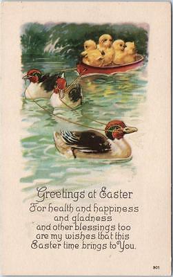 Vintage EASTER Postcard "Greetings at Easter" Ducks Towing Boat w/ Chicks UNUSED