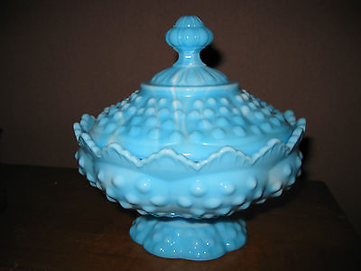 Title (ebay affiliate link): Fenton Blue Milk Glass Hobnail Compote Lidded Candy Dish Bowl Marbled Swirls