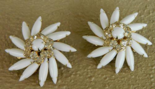 Title (ebay affiliate link): Vintage Judy Lee Earrings white milkglass rhinestone pinwheel signed EVC