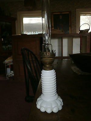 SUPER HAND PAINTED MILK GLASS Oil LAMP, BRASS BURNER & CHIMNEY