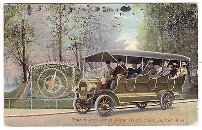 ANTIQUE 1910 TOURIST AUTO CAR AT WATER WORK'S CLOCK DETROIT MICHIGAN POSTCARD