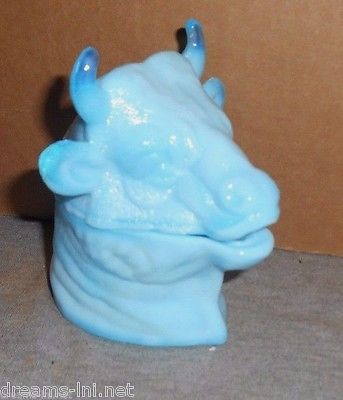 BLUE MILK GLASS FERDINAND THE BULL HEAD MUSTARD OR CONDIMENT COVERED JAR COW c