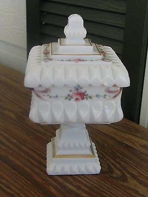 Pedestal White Milk Glass Painted Candy Dish with Lid