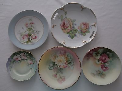 5 GORGEOUS ANTIQUE HAND PAINTED PLATES W/ CABBAGE ROSES PINKS BAVARIA