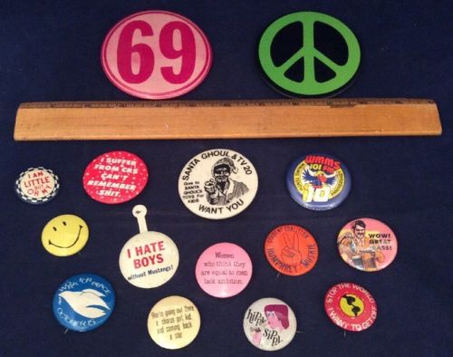 Title (ebay affiliate link): Vintage 1960s PIN BACK Collection:15 FUNNY/HIPPY/POLITICAL/WMMS Pins- RARE (H8)
