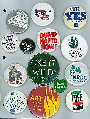 Title (ebay affiliate link): 14 Vintage 1990s Political Cause Pinback Buttons Free Kuwait Dump Nafta Now