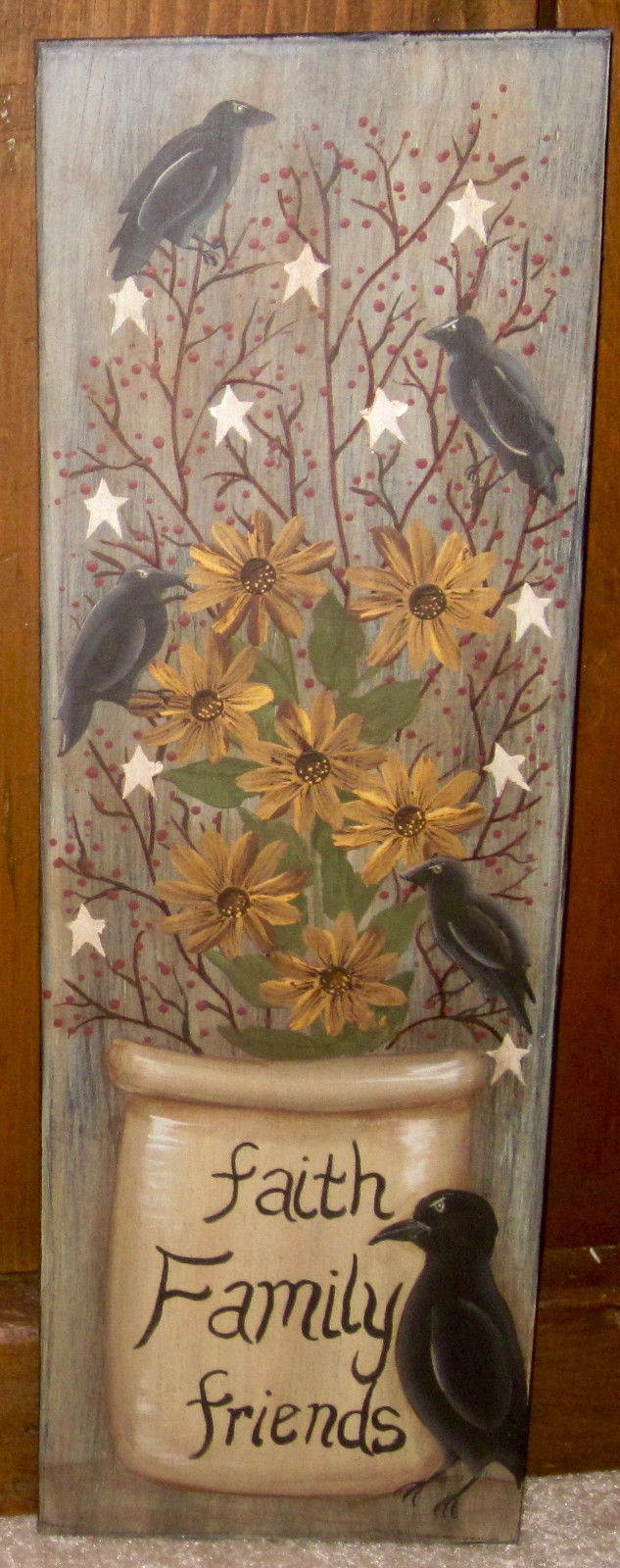 Title (ebay affiliate link): *~*PRIMITIVE*~* HP FOLK ART CROCK * CROW * SUNFLOWERS * STARS *~* BOARD