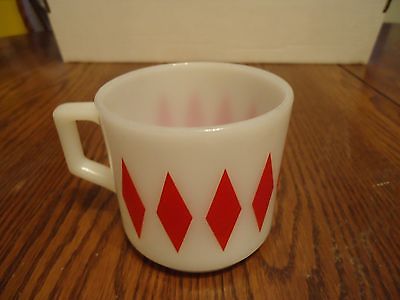 Mid Century Anchor Hocking Fire-King Red Diamond Harlequin Milk Glass Coffee Mug