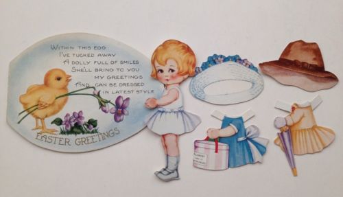 Title (ebay affiliate link): Vintage Easter Paper Doll Greeting Card Egg Die Cut Embossed Unused