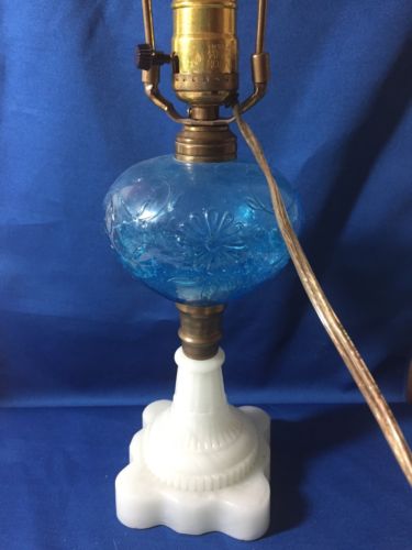 Title (ebay affiliate link): Antique Blue Glass Brass Milk Glass Base Oil Lamp Electric Conversion
