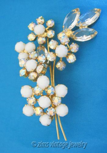 Title (ebay affiliate link): Vintage D&E JULIANA gold White milk glass FLOWER Bouquet rhinestone PIN brooch