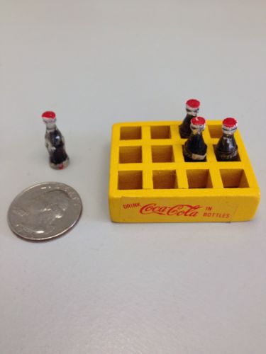 Title (ebay affiliate link): Vintage Case of Miniature coca cola coke bottles w yellow wood Case Doll house