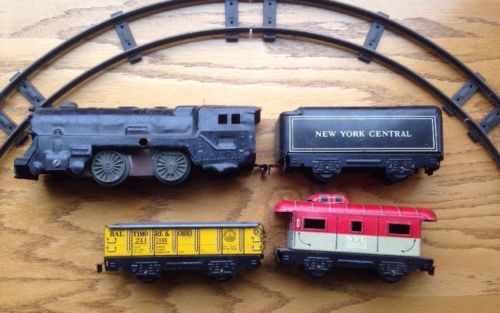 Title (ebay affiliate link): Vintage Wind Up MARX TOY Tin Trains - Locomotive + Cars Caboose Round Track
