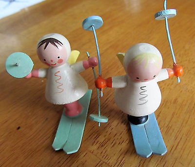 2 Vintage Wooden SKI ANGELS Painted