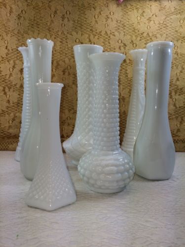 Title (ebay affiliate link): 7 PC Lot White Milk Glass Hobnail Diamond Vases Wedding Crafts Flower Lot 1