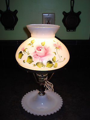 VTG MILK GLASS TABLE LAMP HAND PAINTED PINK ROSES ON SHADE