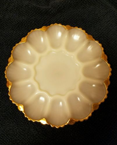 Vintage Anchor Hocking Milk Glass Gold Trimmed Deviled Egg Dish Plate