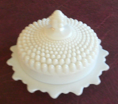 Title (ebay affiliate link): VINTAGE WESTMORELAND AMERICAN HOBNAIL MILK GLASS ROUND COVERED BUTTER DISH! 1952