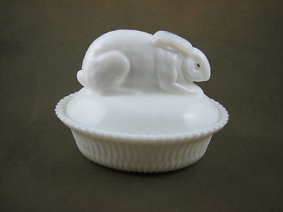 Vintage McKee Milk Glass Covered Dish ~ Rabbit on Split Reed Base ~ VG Condition