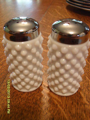 Title (ebay affiliate link): Vintage Fenton Milk Glass Hobnail Salt & Pepper Shakers~Heavy 4" Original Tops
