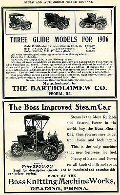 1906 BOSS STEAM CAR KNITTING MACHINE WORKS AD GLIDE CAR THE BARTHOLOMEW CO. AD