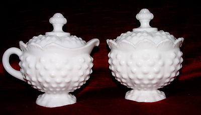 SCALLOPED EDGE WHITE MILK GLASS SUGAR & CREAMER W/ LIDS